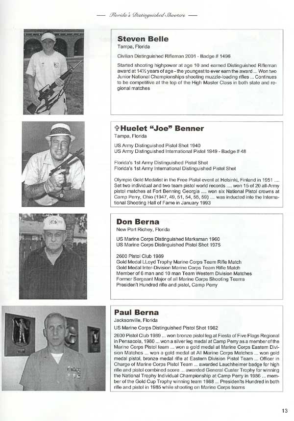 | A page from Florida’s Distinguished Shooters shows Heulet Benner, Olympic Gold Medalist, Distinguished Pistol Shot and Distinguished International Pistol Shot and one of the most successful of American competitive marksmen.