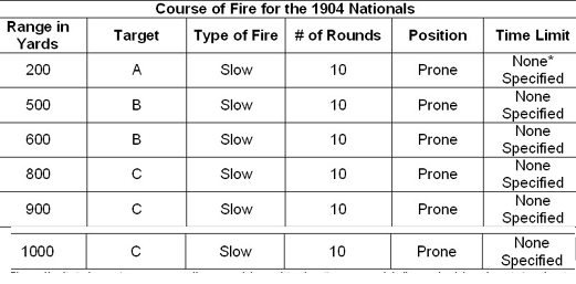 Summary of Skirmisher's Course Rules > Both targets ("squaw" and "papoose") were located on top of the butts at the 600-yard line. > Movement of shooters between yard lines = ½ quick time, ½ double time. > All shooters move as a "skirmish line" down range on command at each yard line. As a strategy, most competitors fired at the "squaw (kneeling) target" down to and including 350 yards. They then fired at the "papoose" target at 300 and 200 yards. Colonel Whelen recounted that he personally used the junction of the target and the ground as an aiming point, and set his sights to hit into the (wider) shoulder area of the kneeling target. The Selection of the Departmental Teams: As in previous years, each Army Department (such as the Department of California, the Department of Arizona, etc.) held annual rifle competitions. As a matter of course, the two best rifle shots from each company of Infantry (similarly from each equivalent Cavalry and Artillery Regiment) and the two best rifle shots among the officers of each Infantry, Artillery and Cavalry Regiments were ordered to attend the Departmental Matches as competitors. All competitors fired the course(s) as described above. In keeping with the method of the day for selecting the "Departmental Team," the top 12 shooters in the Departmental Matches became the Departmental Team. Medals in the Departmental Matches were distributed as follows: The winner was awarded a gold medal, the second two individuals were awarded silver medals and the last nine shooters were awarded bronze medals. In a year such as 1904 where an All-Army Match was not held, these Departmental Teams supplied the raw material used by each Army Branch to select a team to represent them at the National Matches. The 1904 National Trophy Matches: The 1904 National Trophy Matches are not as well documented as those held in 1903, but we have the recommendations of the National Board for the Promotion of Rifle Practice for the conduct of the matches. The NBPRP recommended that the 1904 National Trophy Match include one run of the Skirmisher's Course, and two (2) full scores of "timed fire" at rectangular targets(?) and rapid fire if possible. The year 1904 was an off year for the All Army Match (the All Army Match was to be held in alternate years), but the Departmental Matches were held in standard fashion utilizing two runs of the Excellence-in-Competition Match (including two skirmish runs) fired in 1903. The All-Army Team (always consisting of 12 men in those days) was selected from the best shooters "making" the Departmental Teams. If Colonel Whelen's recollections are to be believed, the National Trophy Match held at the Nationals in 1903 utilized one run through the standard Army Qualification Course (Excellence-in-Competition Match) and one run through the Skirmisher's Course - plus 10 shot strings of slow fire at 800 and 1000-yards. The course set forth by the National Board differs somewhat from Colonel Whelen's notes. In 1903, the National Board called for "a string of slow fire to be fired at each of the following ranges: 200, 500, 600, 800, 900 and 1000 yards." Apparently, the course of fire for the National Trophy Match in 1904 actually consisted of 60 rounds, fired in a series of slow fire strings at 200 yards, 500 yards, 600 yards, 800 yards, 900 yards, and 1000 yards, all prone with the shooters head toward the target. In chart form it would look as follows: