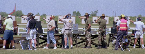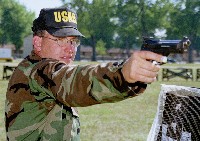 ![]() Sgt. James Henderson demonstrates the pistol stance he used to win pistol shooting's Triple Crown at the 2002 National Trophy Pistol Matches. In CMP service pistol shooting, all shooting is done with one hand at a very difficult bull's-eye target. The 50 yard slow fire pistol target has a ten ring that is only 3.36 inches in diameter. |