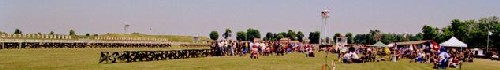 ![]() For one week each year, a 400-point pistol range is set up on the Camp Perry ranges. One of four 100-point ranges is shown here. The turning targets are on the left. Shooters and range officers are firing from the 50-yard firing line in the center. The ready or assembly area is on the right. |