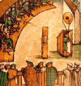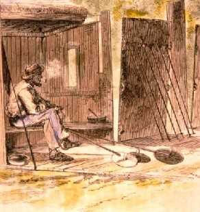 | Pulling pit duty is a favorite topic whenever the National Matches are discussed. Today all highpower rifle competitors must take their turns in the pits where they pull and mark targets while other competitors fire. Some shooters regard this as pleasant interlude where shooters really get to know and enjoy each other. Others regard it as a necessary chore that enables them to shoot the game they love. Pit pulling or target marking duty has been a part of target shooting for at least 500 years, but it is only very recently that shooters have had to pull their own targets. Placing target markers down range, by the targets, so they could mark shots without interrupting shooting and having the shooters themselves walk down range was a practical development, especially when crossbows and rifles became accurate enough to permit shooting at longer distances. One of the earliest records of having a target marker downrange comes from a drawing made during a Swiss crossbow shooting tournament that took place in 1504. In the drawing (top right), the target marker stands in a small wooden cabin placed next to the target. The marker looks through an opening to see where each shooter’s bolt strikes and uses a square paddle to signal the locations. When flintlock and percussion rifles were used to shoot at circular wooden targets in 18th and 19th century German shooting clubs, a target marker was stationed near the target. Several shooters typically fired just one shot at the same target. The target marker often jumped into a hole near the target between shots. When a shot was fired, the target marker jumped out, drove a numbered wooden peg into the fresh shot hole and signaled the shot location (lower right). Young boys were often used as target markers and were given the name, Scheibentoni (target boy). The Scheibentoni motif shown in the illustration here has appeared in several important German shooting festivals and was the pictorial theme of the 1966 World Shooting Championship in Wiesbaden, Germany. |