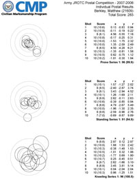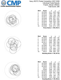 The top precision score in the four 2007 JROTC postals was a 296x300 fired by Steven Frazier from Union Grove HS Navy JROTC in McDonough, Georgia. The score data and shot locations from Frazier’s targets are shown here in a *.pdf file that was downloaded from the CMP website. |
