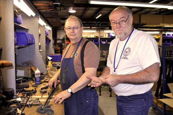 Bob Bell, left, a CMP North Store associate, recently spent a week with CMP South armorers to get a better understanding of CMP South operations. He is flanked by Phil New, CMP South lead armorer.