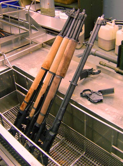 Prior to degreasing, buttstocks are removed and rifles are then racked and given a hot water and detergent solution bath in an ultrasonic tank at 120 degrees and at least two or three rinses prior to moving to a drying area.