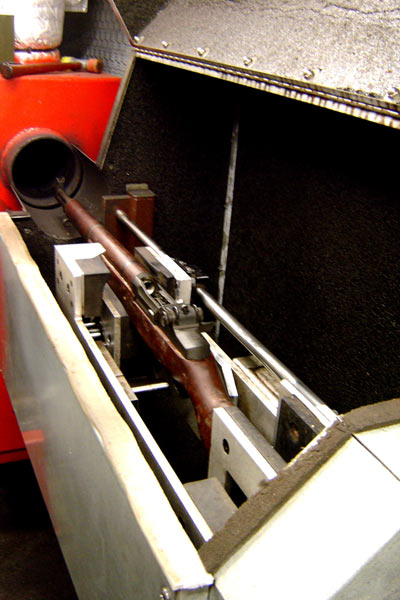 An M1 rifle locked in the test-firing chamber prepared for function testing. The overhead door is closed and locked and the rifle is fired with a remote switch until empty.