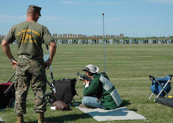 The 2005 USMC Junior High Power Clinic wrapped up yesterday with awards and pizza for the 129 juniors in attendance. All successfully completed three days of instruction from members of the Marine Corps Rifle Team that included the 2005 Interservice individual winner Sgt. John Godwin. Sgt. Godwin was excited to see the progress the juniors were making in the clinic. “Helping the kids is a lot of fun; it’s awesome to see how much they can improve. Teaching marksmanship is what the Marine Corps Team is all about. We want to make a good impression on these juniors who may one day become Marines. It is important for them to understand that we joined the Marines to become a Marine, not to just be a shooter,” said Sgt.Godwin.