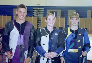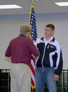 |  The top three individual shooters in the precision category were Leah Wilcox, Shelbyville High School (KY, center, 1st), Daniel Belluzzo, Northern Minnesota (MN, left, 2nd) and Rachael Glenn, Yellowstone Rifle Club (MT, right, 3rd). |  During the Junior Olympic Championship award ceremony Junior Distinguished Badge #27 was presented to Michael Nulk, who recently graduated from LaCueva High School, Albuquerque, New Mexico. The badge was presented by CMP Director Gary Anderson. Nulk competed in the championship, but had earned his Junior Distinguished Badge in earlier competitions. He departed immediately following the Junior Olympic Championship for West Point where he became a new USMA Cadet. |