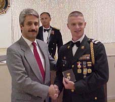 ![]() Bogalusa High School Cadet Brandon Green was the first shooter in the nation to earn the Junior Distinguished Badge that was inaugurated in 2001. Here he is presented Badge #1 by CMP Training Director Bob Foth. Major Fredieu stands behind them. |