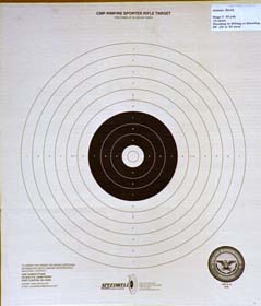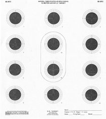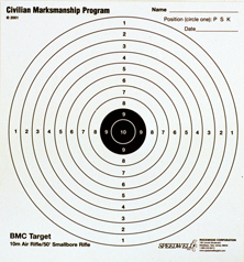 | CMP to Sell Targets. The CMP now sells three special targets for use in the CMP Rimfire Sporter Match, position air rifle shooting or basic rifle marksmanship instruction. The targets are a new addition to the CMP program that provides basic equipment and supplies needed by teams and clubs for marksmanship training and entry-level competitions. The program offers special prices so that teams and clubs can offer marksmanship training and competitions to as many youth and adults as possible. The targets now available from CMP Sales are: o Rimfire Sporter Rifle Targets. These are full-sized targets with 1.76" white ten rings to facilitate scope sight aiming. They are designed for 50 and 25 yard shooting in CMP Rimfire Sporter Rifle matches. For full-sized targets, order NLU049, $6.50/100. For target centers only, order NLU050, $6.00/100. o 10-Bull Air Rifle Targets. These are standard 10-bull air rifles targets for use in standing and three-position air rifle training and competitions that are promoted by National Three-Position Air Rifle Council member organizations. These targets may be ordered from CMP Sales for a cost of $12.50 per 250 targets. Order NLU051. o BMC Smallbore/Air Rifle Training Targets. The BMC (Basic Marksmanship Course) targets are specially designed for firing at 50 feet (smallbore rifles) or 10 meters (air rifles) when teaching basic rifle marksmanship to juniors or adults. The targets have large scoring rings that are designed to contain almost all well-aimed shots fired by new shooters. This gives them positive feedback that is not available when using the smaller, more difficult competition targets where many new shooters' shots are misses. Students should "graduate" to the regular 50 feet or 10-meter targets after they are able to keep all of their shots in the eight or nine rings on BMC targets. Order BMC Targets from CMP Sales. Order NLU052, $x.00 per 100. |   50/25 Yd. Rimfire Sporter Target  BMC Target, 50'/10M |