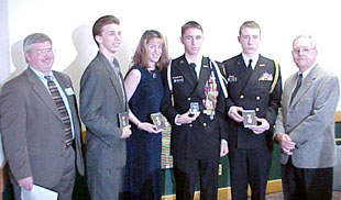 who have earned EIC points to date can be seen at http://www.odcmp.com/Services/ Programs/3PAirRiflePoints.pdf. |  Junior Distinguished Badges were presented at the 2003 Georgia state association meeting to (starting 2nd from left) James Hall, Kristi Smith, Richard Tickle and Jeremy Drennan. Presenters were Roy McClain, GSSA, (left) and BG Richard Capps, CMP (right). |