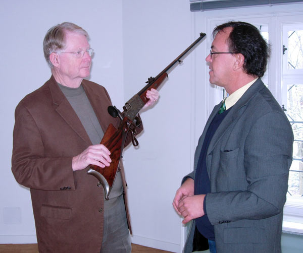 | The CMP’s Director of Civilian Marksmanship, Gary Anderson, discusses one of the most important arms in the new German Shooting Museum with the Museum Curator, Stefan Gruß. The engraved Aydt falling block single shot rifle was a prize of honor for the first German Federal Shooting Festival in 1862.