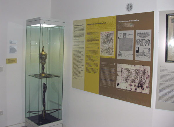 | The displays in the German Shooting Museum begin with marksmanship endeavors by Stone Age men and continue through the development of shooting clubs in German cities in the Middle Ages.