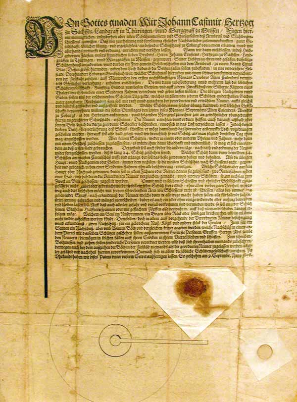 | This official invitation for shooters from neighboring cities to participate in a shooting festival in 1606 is a prized display item in the new German Shooting Museum. Since there was no common standard of measurement in that time, the solid black line on the left side of the document is the standard of measurement to be used for this competition. The targets were to be placed