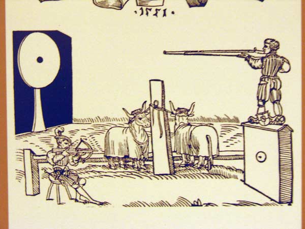 | Drawings and documents from early German shooting events like this “oxen shoot” in 1551 make up a major portion of the museum displays.