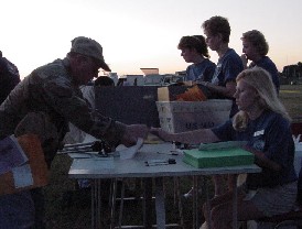 Volunteers also play an important role  throughout the day--from beginning to end,  nearly 200 volunteers will be involved in making  sure the Garand Match runs smoothly.  For example, Patricia Siefert has been a  volunteer at the National Matches for 22  years, and has been part of the Garand Match  since its beginning in 1998. Her first volunteer  task at Camp Perry was in 1980 as a "telephone  talker" in the alley pits. For the 2001 Garand  Match, Patricia served as a relay coordinator  "counting heads and making sure there's five  on each target point.