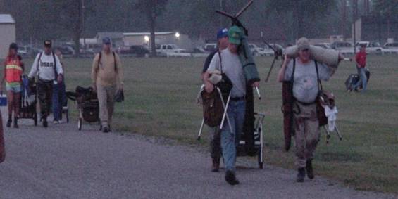 ![]() The long walk in the dark: Competitors begin preparing before dawn for the President's 100. A storm the night before dumped an inch of rain and produced winds up to 60 miles per hour, and clouds in the early morning appeared to promise much of the same. Thankfully, weather conditions improved, and competitors were treated to a clear, sunny day. |