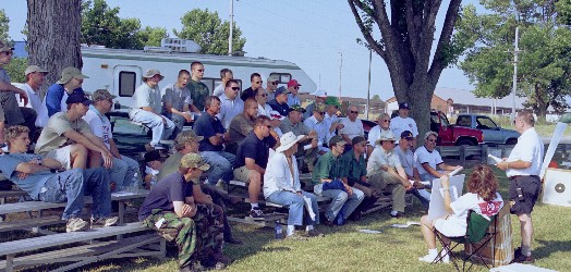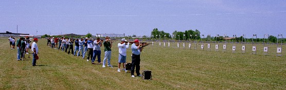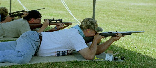 ![]() The third Rimfire Sporter firing position is standing or offhand. A full relay of shooters in the National Rimfire Sporter Match is on the 25-yard line firing in the standing position. Firing in this stage also includes 10 shots slow fire and two 5-shot rapid-fire series. The small amount of equipment that these shooters need to fire the match can clearly be seen in this photo. |